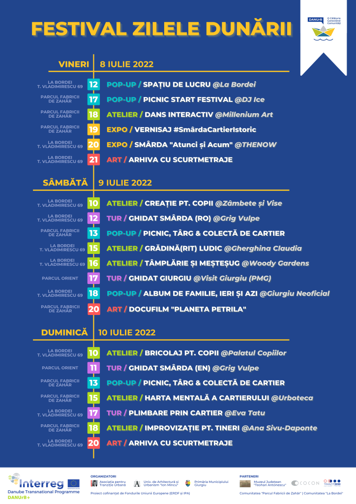 La Giurgiu, în perioada 8-10 iulie, va avea loc Festivalul “Zilele Dunării”. Organizatorii au pregătit, printre altele, ateliere de dans interactiv, de tâmplărie şi meşteşug, de bricolaj pentru copii, de improvizaţie, vernisaje, prezentarea unor scurt-metraje din arhivă, picnic, tururi ghidate prin oraş.