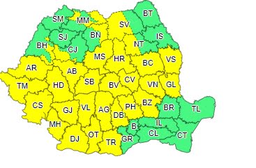 Potrivit Administraţiei Naţionale de Meteorologie, primul Cod galben va fi în vigoare de vineri ora 12.00 până sâmbătă ora 12.00. Conform sursei citate, în Banat, Oltenia, local în Crișana, Transilvania, Muntenia, în sudul și centrul Moldovei, precum și în zonele de munte vor fi perioade cu averse torențiale, descărcări electrice, intensificări ale vântului și izolat grindină și vijelii. În intervale scurte de timp sau prin acumulare, cantitățile de apă vor depăși 25…30 l/mp și izolat 40…50 l/mp.