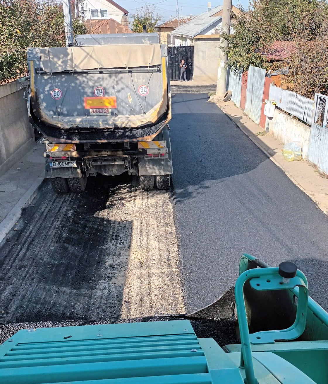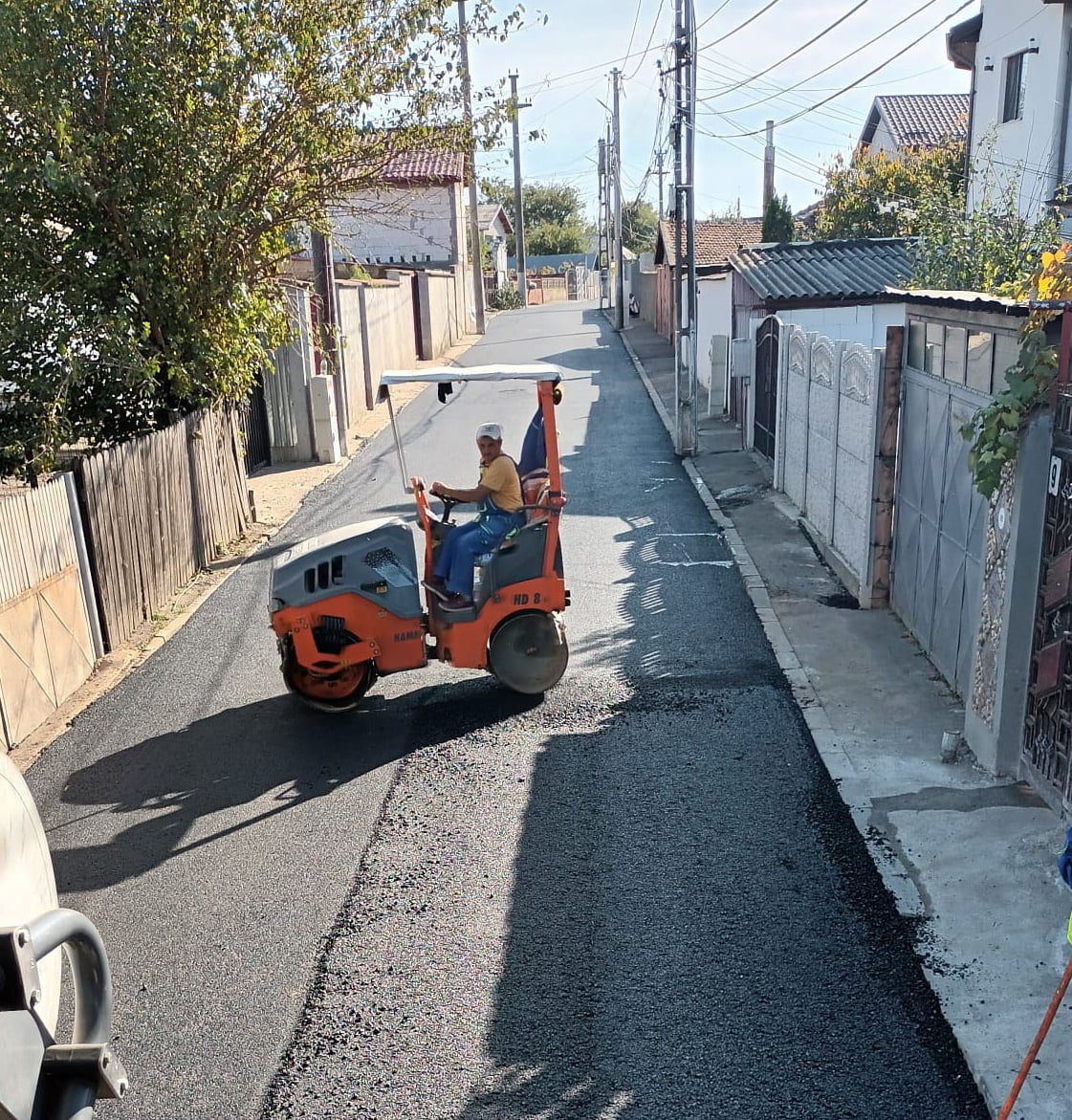 “Asfaltare în desfășurare. Suntem în localitatea Glina. Strada Apei ( 205 metri lungime/ 5,5 metri lăţime) arată deja ca în palmă. Am așternut stratul de uzură ( BA16), de 5 centimetri grosime.